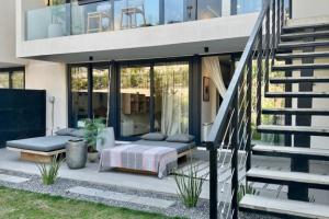 En piso uno: Tres dormitorios; El principal en suite con baño completo con ducha y walking closets; Baño dos completo para el uso de las otras dos habitaciones; Una sala de estar. Las tres habitaciones tienen salida al patio privado.